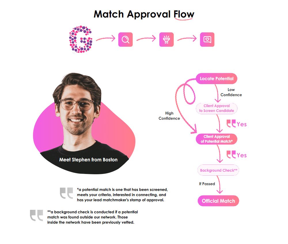 Within 48 hours of completing your questionnaire, you’ll meet your lead matchmaker—your main point of contact moving forward. You'll also be supported by a team that may include a Senior and/or Junior Matchmaker. Prior to your interview, you’ll receive emails about photo submission, criteria confirmation, and scheduling.